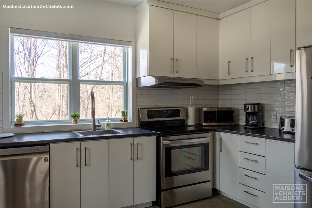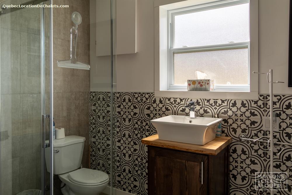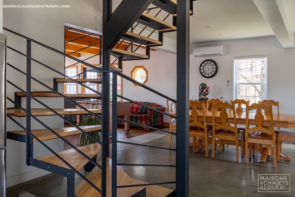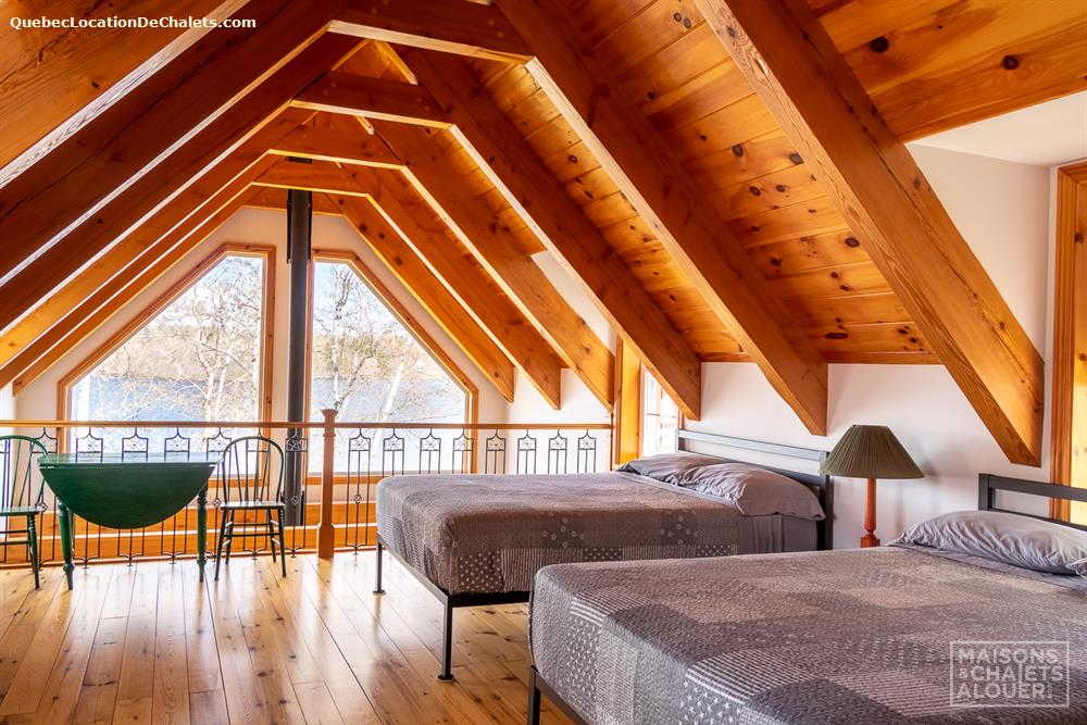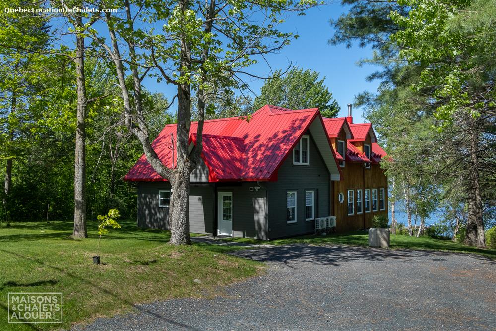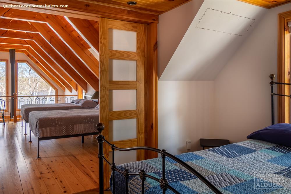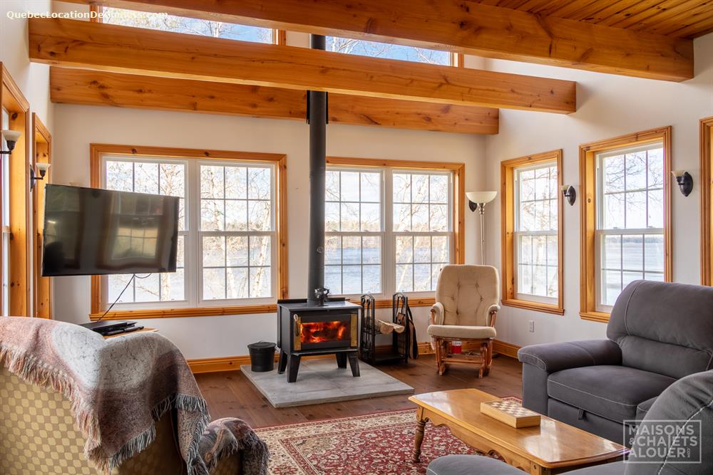 This cottage for rent for 10 people includes 2 bedrooms with a Queen bed in each, and a mezzanine with 2 Queen beds. To have access to the mezzanine, you need to pass through one of the bedrooms. The house of course includes a fully equipped kitchen for your stay. It is open concept with the dining room and the living room. The house offers a beautiful light thanks to its many windows overlooking the lake. A bathroom with a large glass shower completes the facilities.