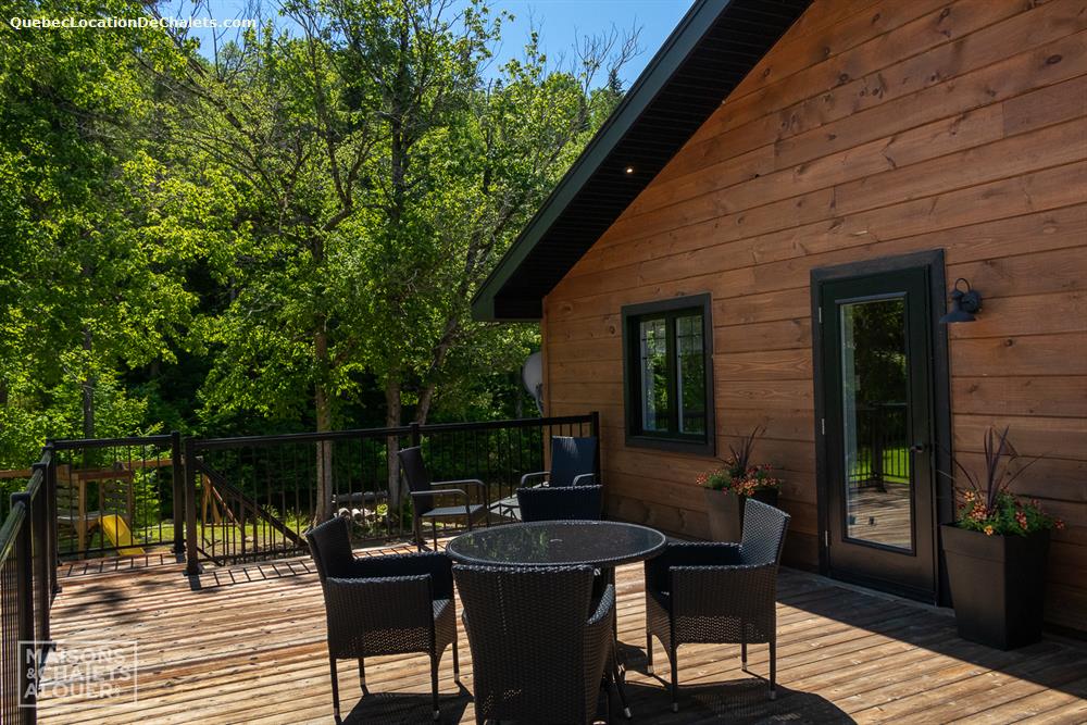 Luxury blended with nature awaits you at Le Grand Roy cottage. This stunning cottage in Lanaudière is located in Mandeville, on the banks of the Mastigouche River. The environment is wooded and very private, allowing you to fully immerse yourself in nature. An artificial pond with its water fountain adds to the enchanting decor of the place. The exterior has been designed so that you can enjoy it all day during the beautiful season. You will find a large outdoor table for al fresco dining.