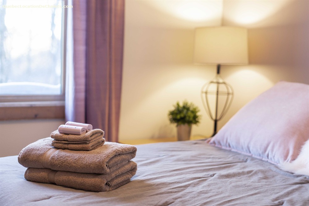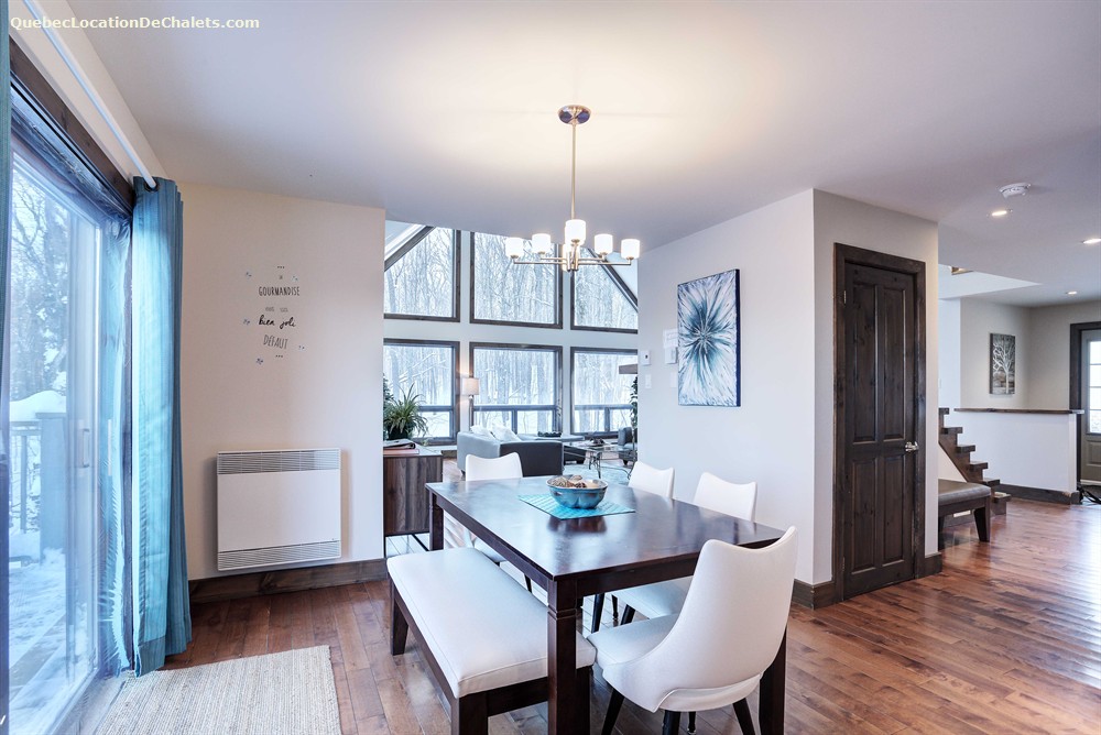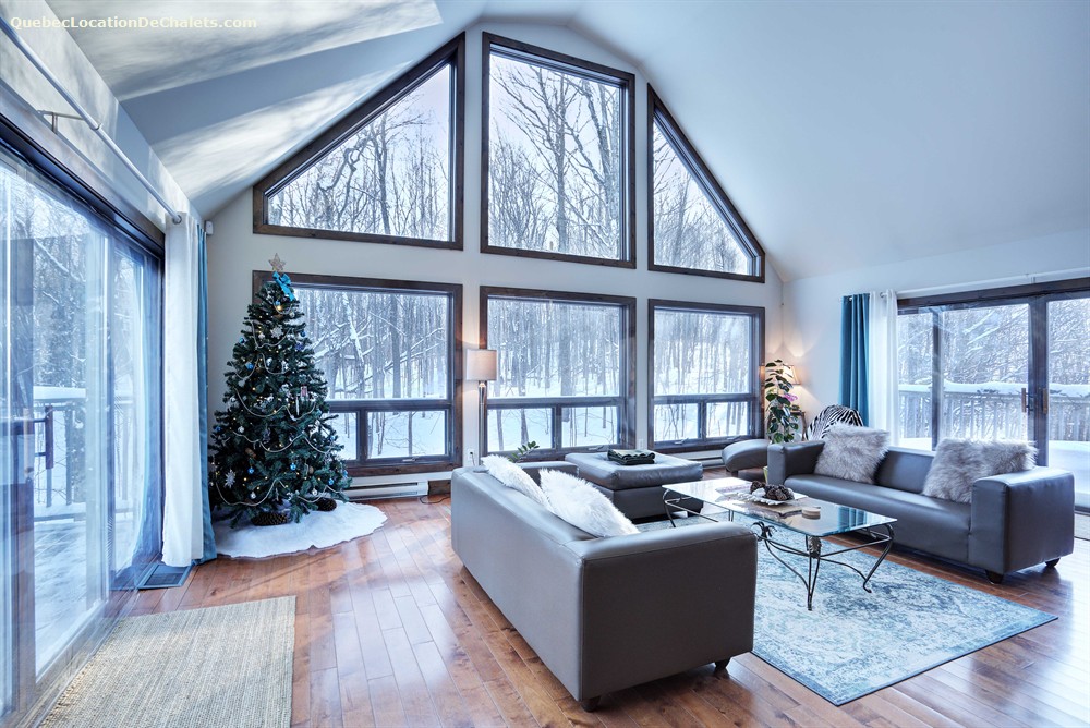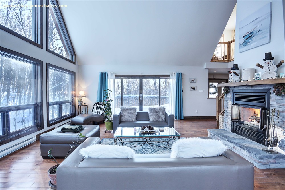 The ground floor contains a spacious living room with a cathedral ceiling, with views of the surounding nature and a large fireplace. You will find a bathroom, a fully equipped kitchen with a dining area and a view of the Laurentian mountain range.