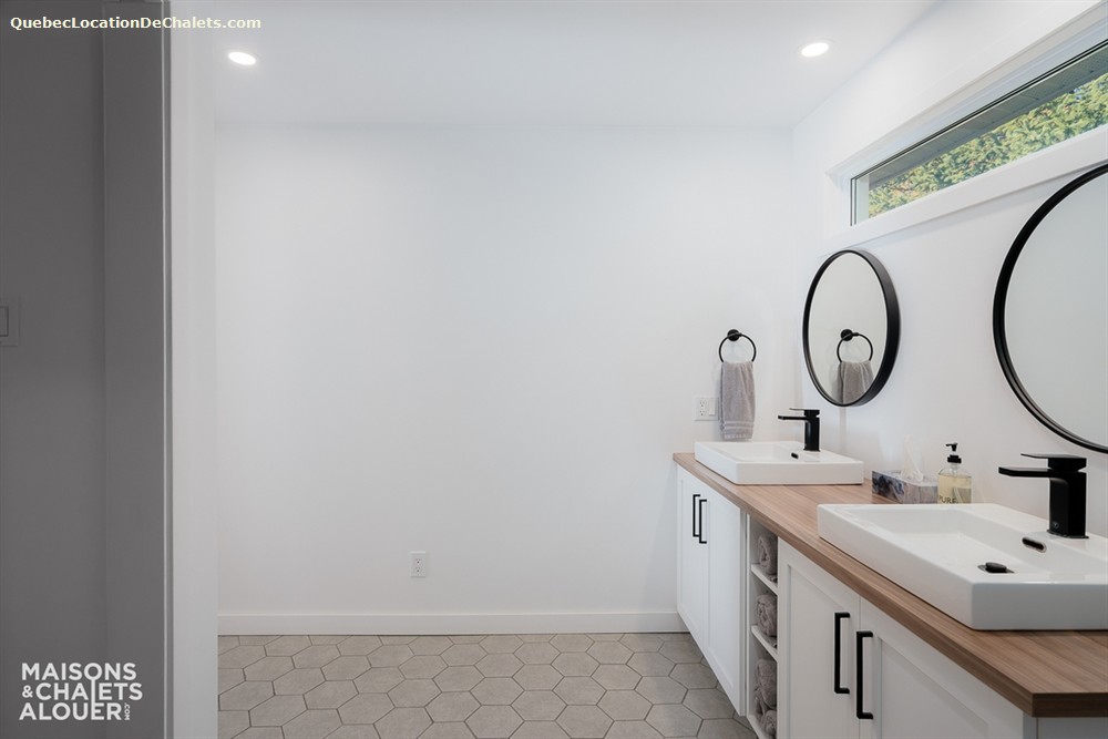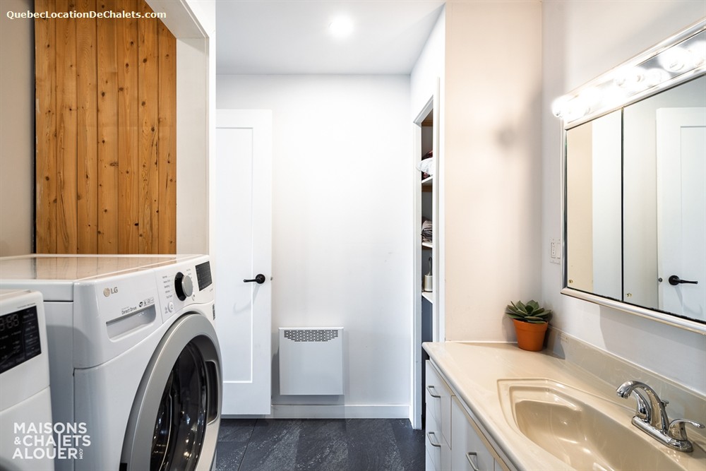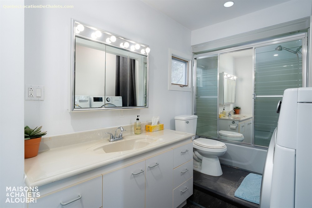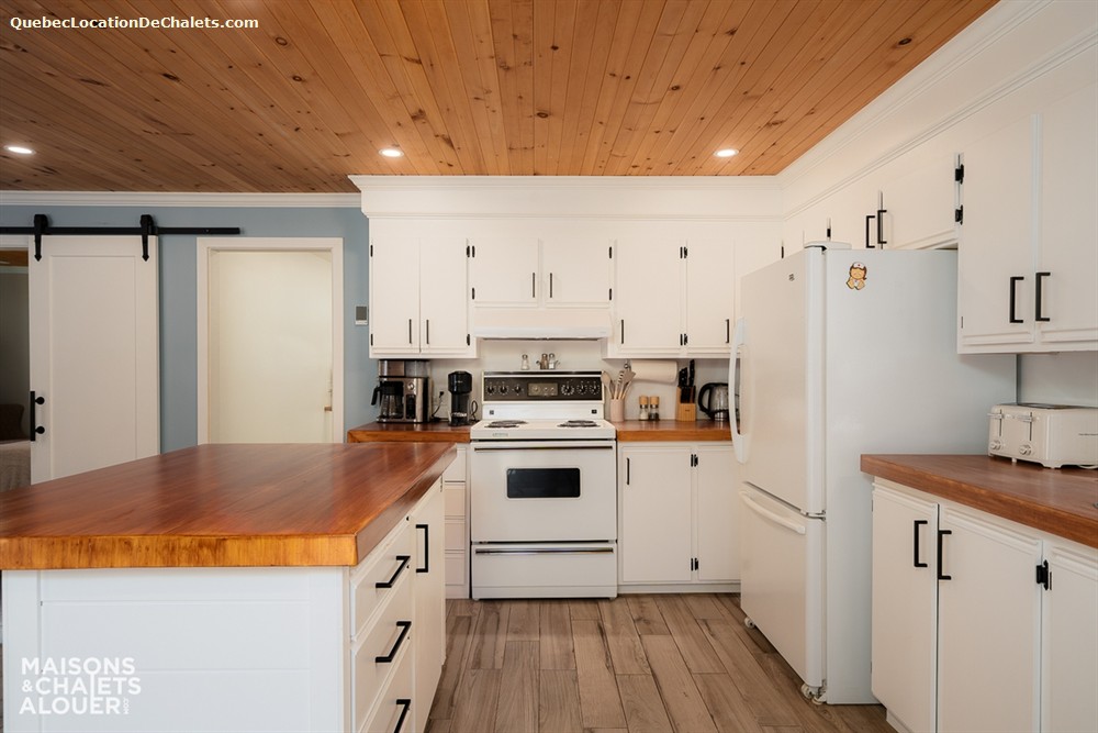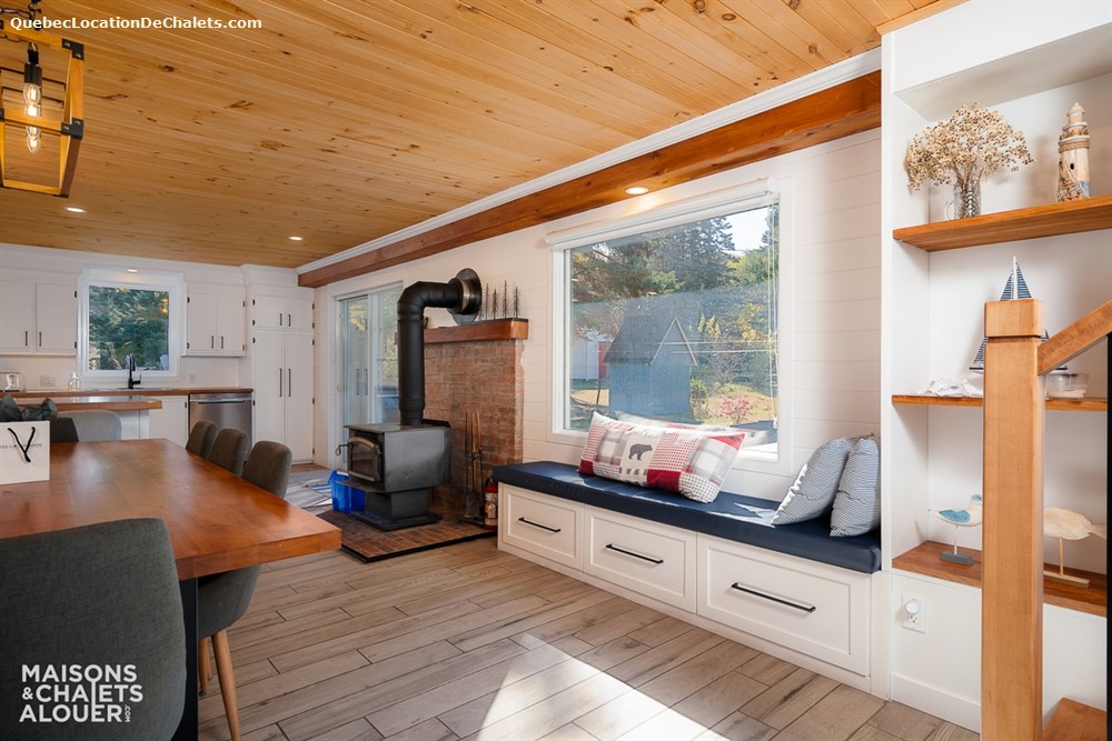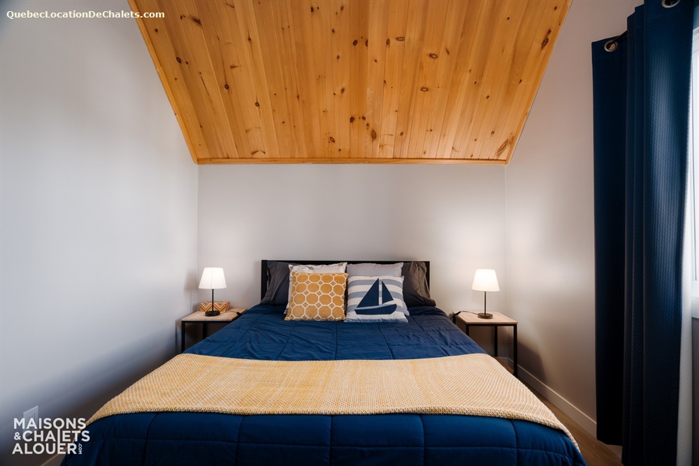 This cottage for rent offers three closed bedrooms, one bedroom on the ground floor with Queen bed, two bedrooms upstairs with Queen bed and Double bed and two pretty full bathrooms. The large common room includes the kitchen, dining room and open living room, it is also equipped with a wood and gas fireplace in the living room. In closing, the owners have thought of your comfort with a heated floor everywhere on the ground floor.