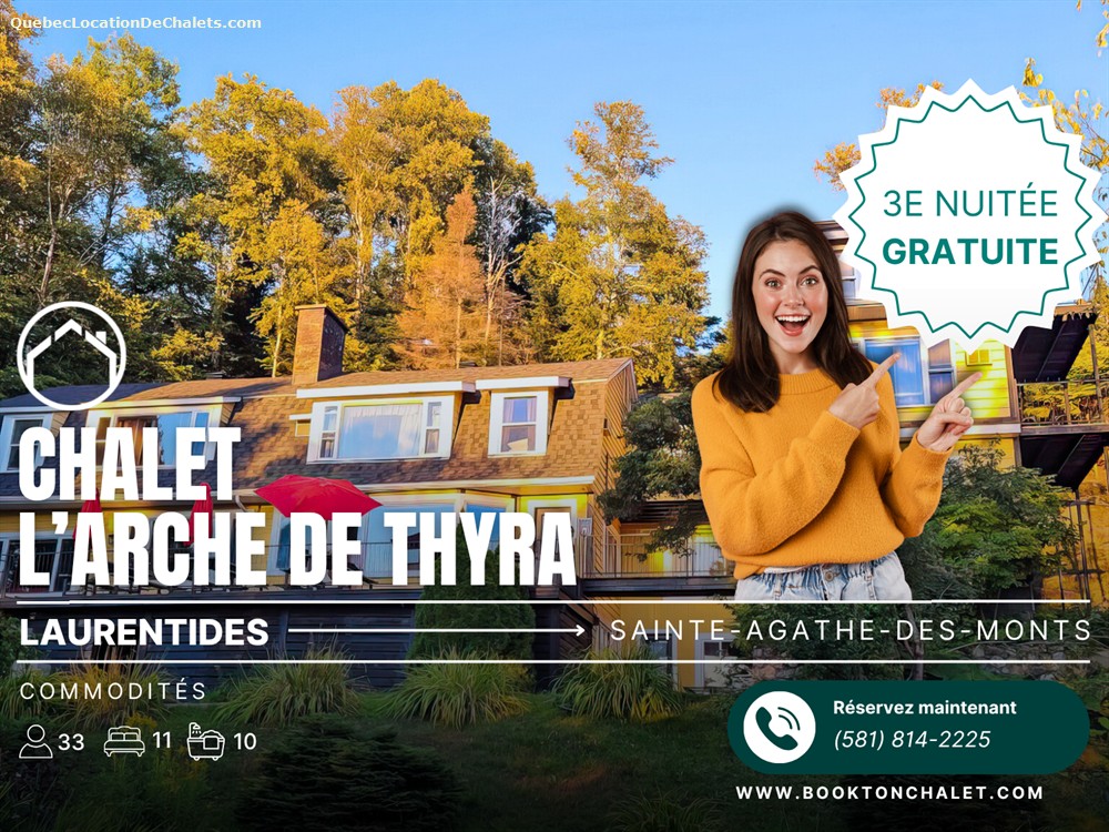 Stay at L'Arche de Thyra, nestled in the heart of the Laurentians in Sainte-Agathe-des-Monts. Enjoy stunning panoramic views of Lac des Sables and take in the most spectacular sunsets from the top of the hill. With a capacity of up to 33 people, this chalet is perfect for family reunions, holidays with friends or corporate retreats.