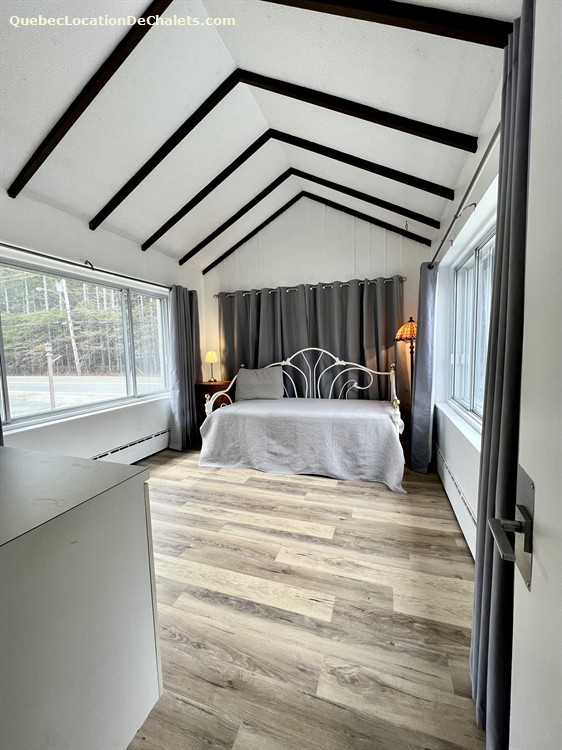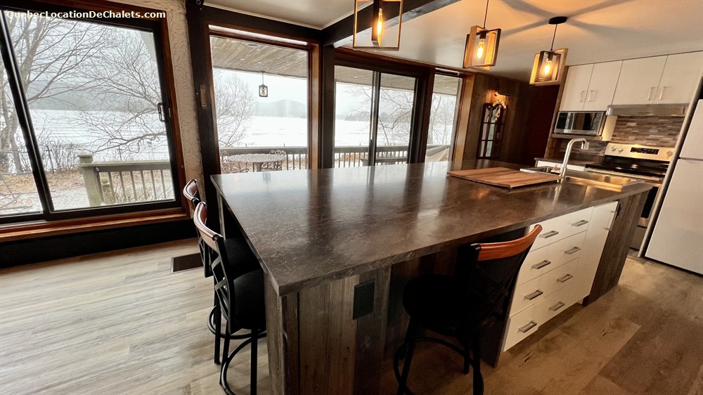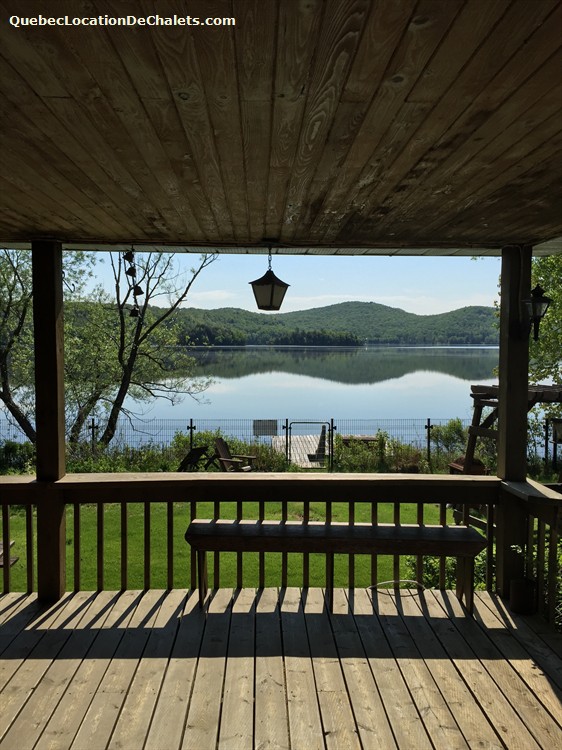 The living room and dining room are open concept with a fully windowed side offering an incredible view of the lake. A stone fireplace and a cathedral roof embellish the whole. A large covered balcony runs along the entire chalet and protects you from the sun and rain. Two bathrooms: one on the ground floor with bath and shower and on the 2nd floor with shower. Dishwasher, washer and dryer available.