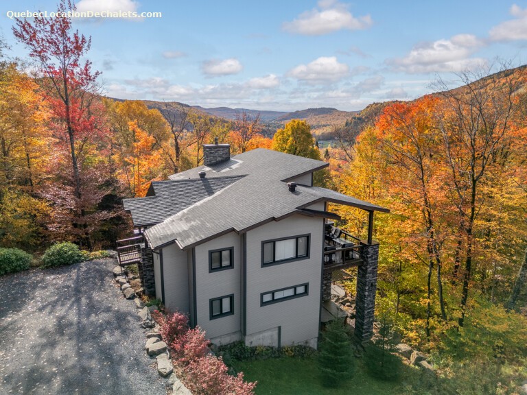 Luxury mountainside chalet for rent, surrounded by trees offering great privacy. High-quality rustic-chic décor, modern kitchen, inviting and comfortable furnishings, pool table, foosball table, private spa, large covered terrace, fireplace, BBQ, and abundant windows opening onto the slopes of Stoneham Mountain. Large parking area. A unique experience that will make your stay an unforgettable memory.