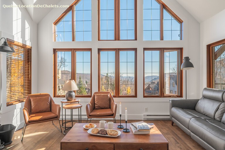 Chalet for rent featuring a large open-concept living area with plenty of space for cooking. Bright, elegant, and comfortable, it is located 20 minutes from downtown Québec City and just steps from the ski slopes of Stoneham. Private spa, large covered terrace, pool table, fireplace, and outdoor setup for campfires… a perfect choice.