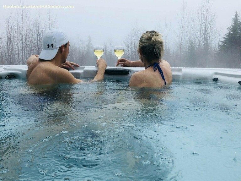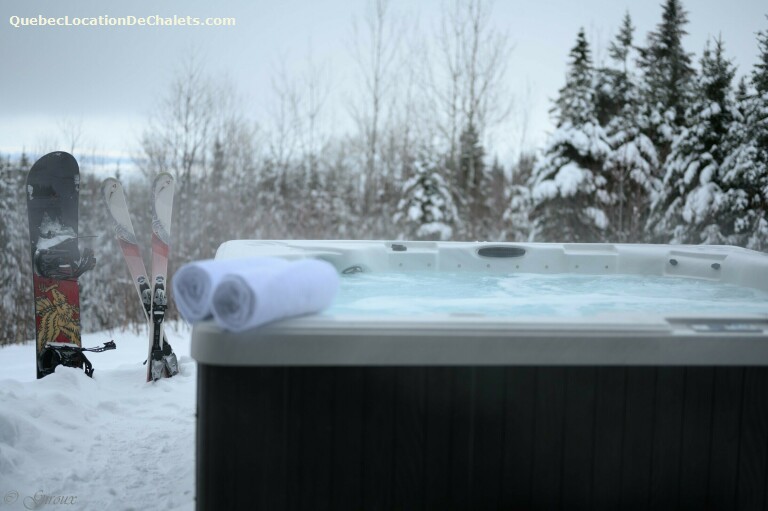 Two air-conditioning units (heat pumps) are available—one on the main floor and the second in the primary bedroom on the ground floor. A slow-combustion fireplace is perfect for cooler evenings. The chalet also features a washer and dryer, BBQ, and an outdoor spa that is operational year-round. Please note that each unit has its own private spa at the base of the chalet. Living area amenities include a television, ping-pong table, board games, and a Wii console. A large walk-in closet is available for clothing storage, as well as an outdoor shed for equipment storage (skis, snowboards, bicycles). The only shared space is the parking area, where several parking spots are available.