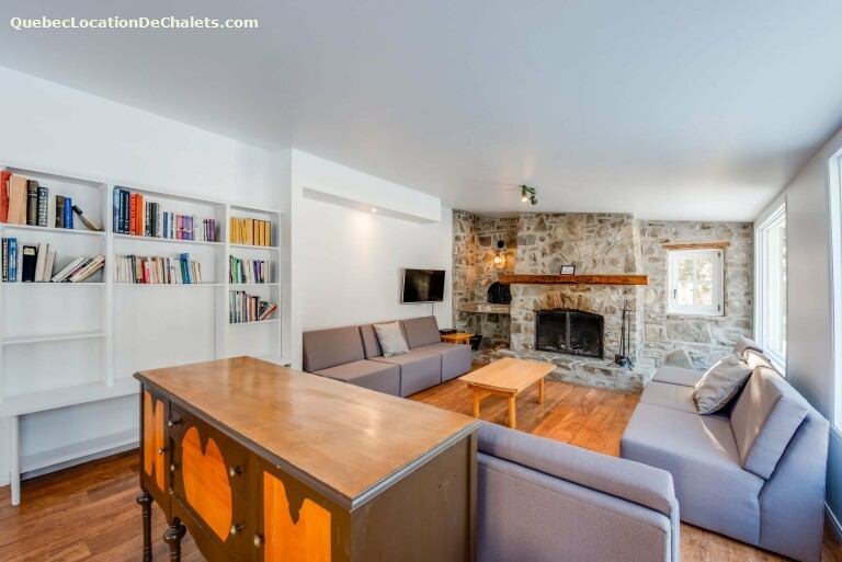 The spacious common area, featuring a dining room and living room, is perfect for hosting large groups. This bright space, filled with natural light from numerous windows, is enhanced by a rustic stone fireplace that spans an entire wall. The fully renovated kitchen makes it easy to prepare hearty meals.