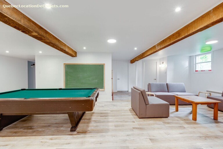 A classroom with a few desks and a chalkboard has been preserved to showcase the chalet's history. Nearby, a game room offers a fun contrast for those who prefer playtime over schooltime.