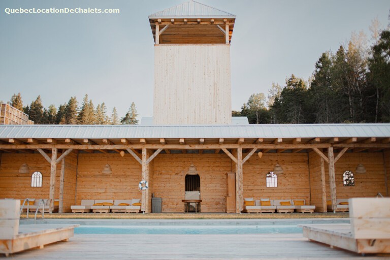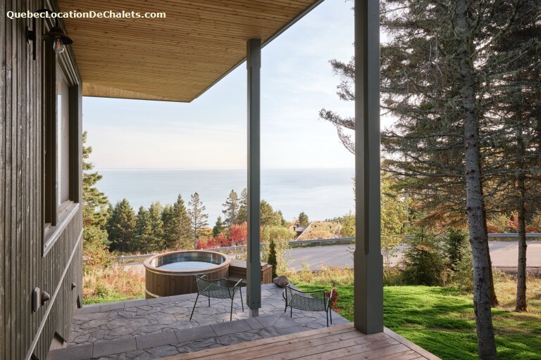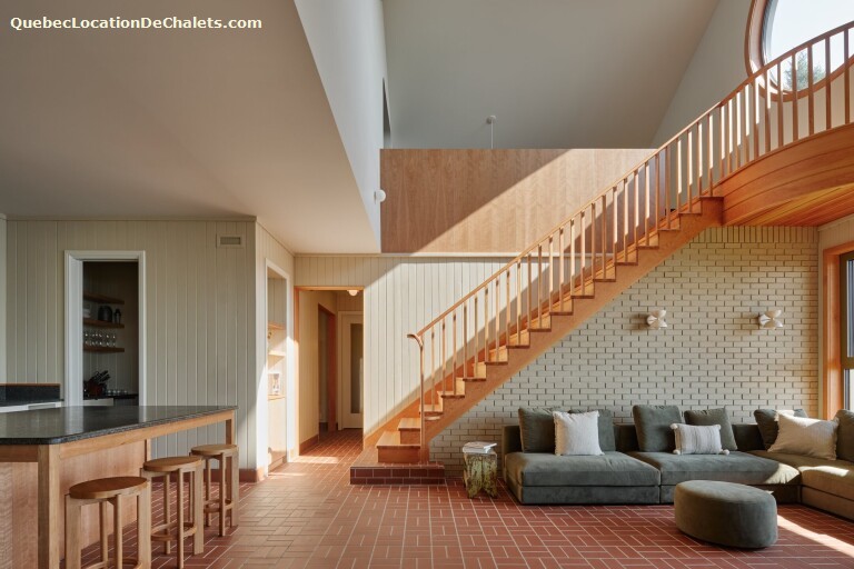 Designed to accommodate multiple families, the living space is organized around a festive central core with a double-height ceiling open to the living area and the surrounding scenery. At the back, the kitchen offers both a panoramic view and all the necessary amenities. The living room is nestled between a warm clay brick wall on the bedroom side and a glass-paneled wooden partition on the dining side. Slightly set apart for lively gatherings, guests seated at the table enjoy dual views: La Malbaie to the right and the river straight ahead. The layout flows seamlessly into the veranda, the gallery, and the spa, before opening onto the deep blue horizon.