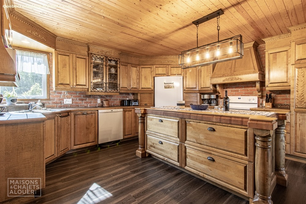 This hospitable vacation home with distinctive woodwork has 7 closed bedrooms with 6 queen-size beds, 4 double beds. 1 Double Murphy Bed can also be used to accommodate up to 20 guests comfortably. The fully equipped kitchen connects with the dining room and large open-area living room with wood stove (wood provided) where guests can relax after a busy winter’s day out of doors. You will also find a pool table in the garage. The cottage has 2 full bathrooms and 1 half bathroom. The main bathroom has an antique bath and separate shower.
