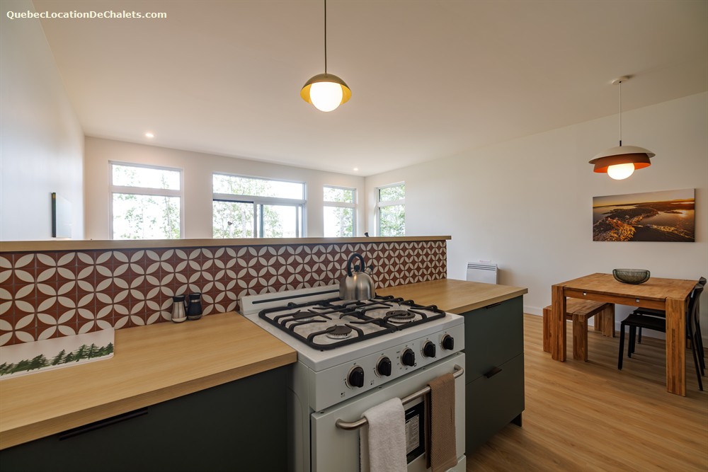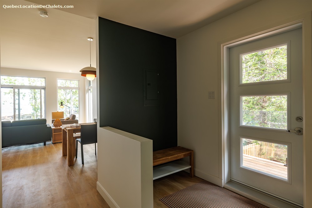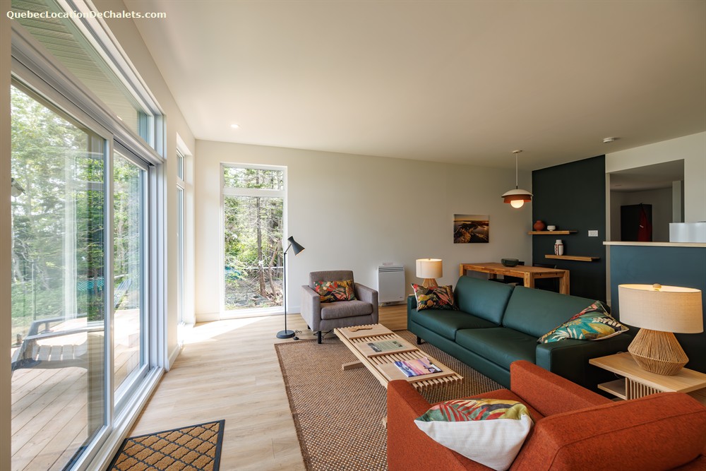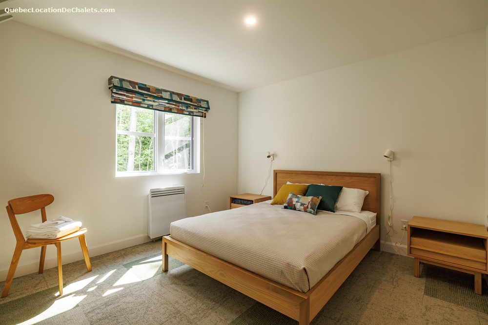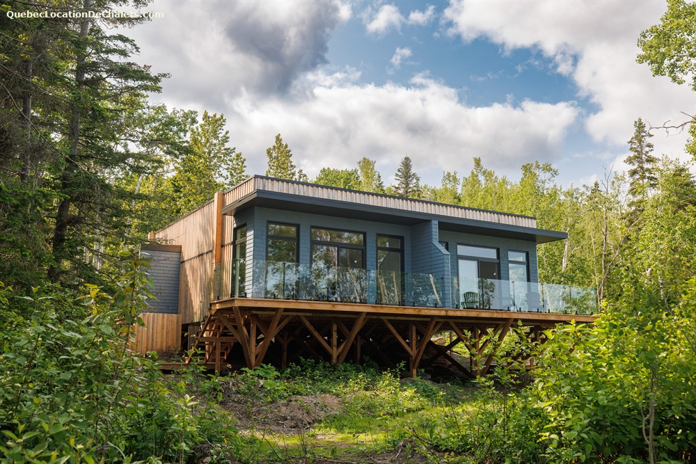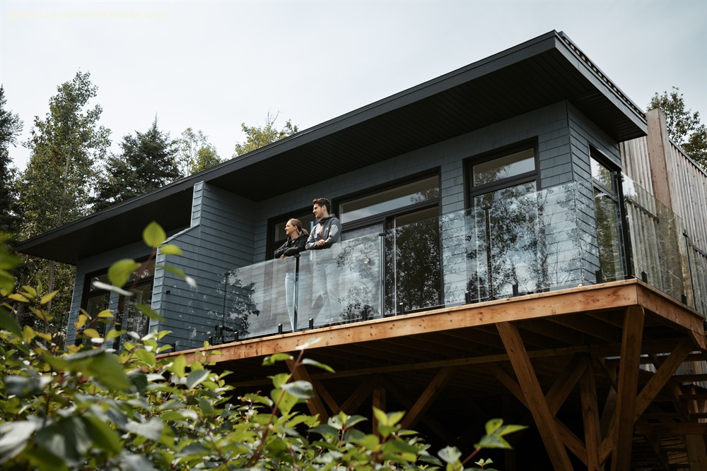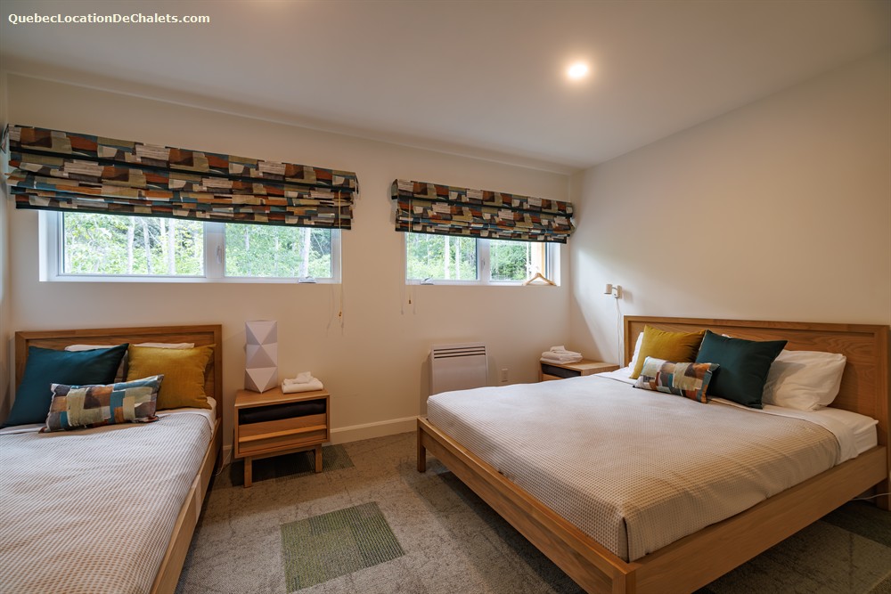 This new chalet, composed of two units (the Grive and the Paruline), comfortably accommodates 2 guests per unit. Guest capacity can be increased to up to 5 people (additional fee) by reserving the connecting bedroom located between the two units.