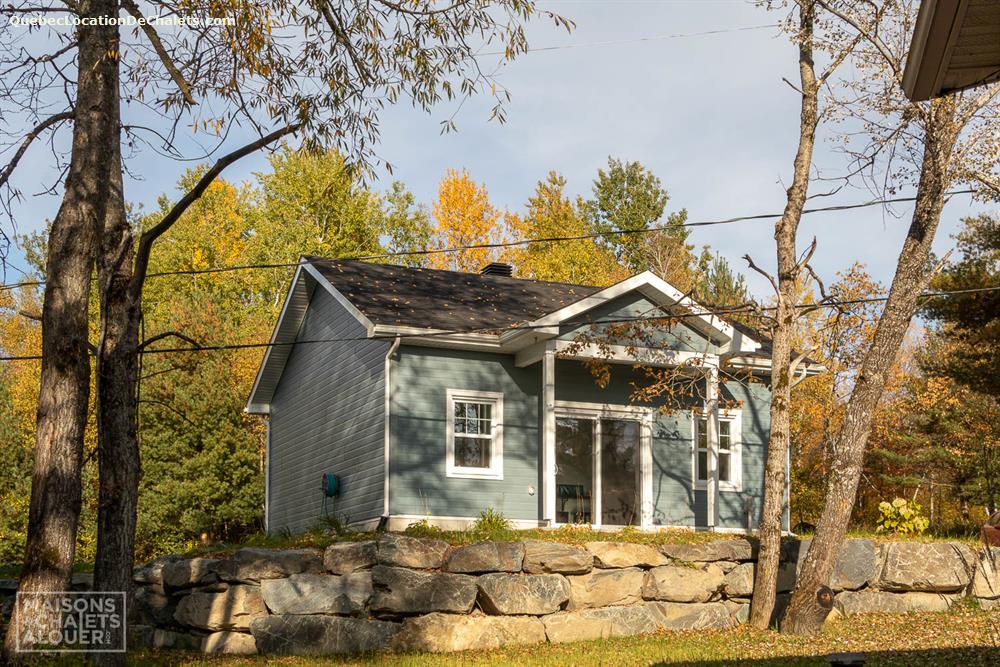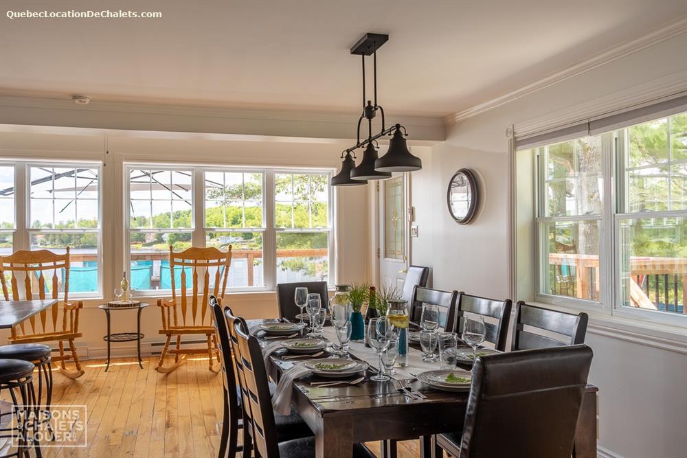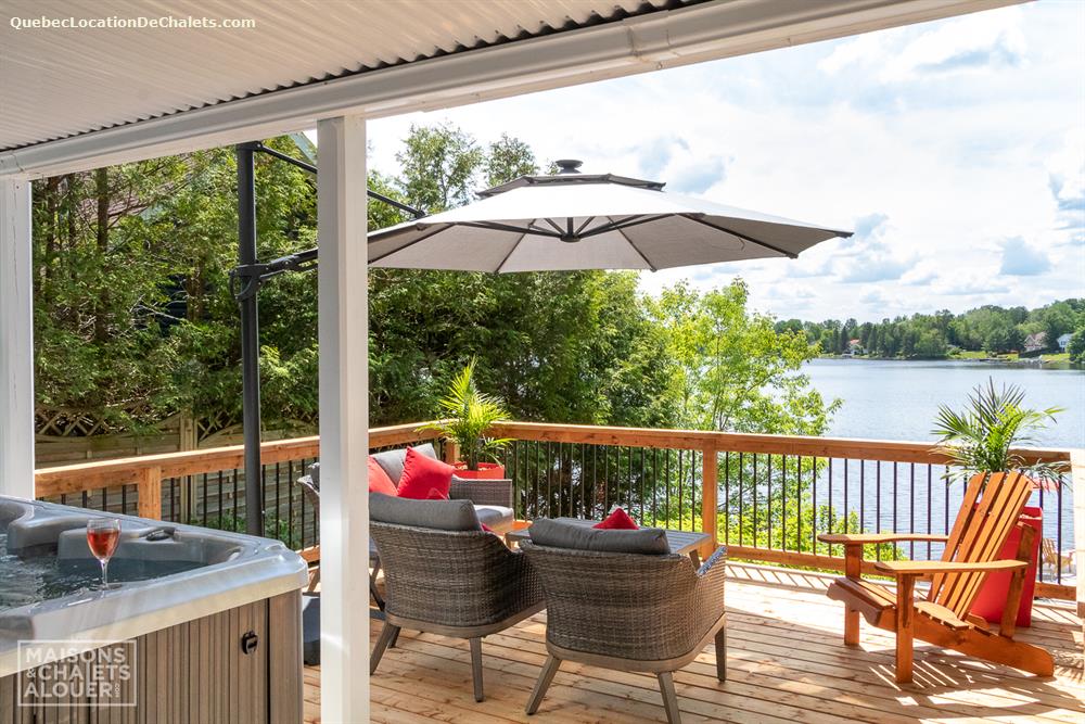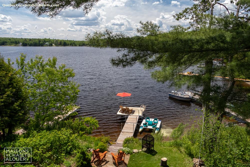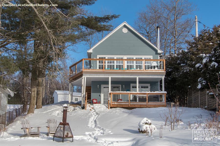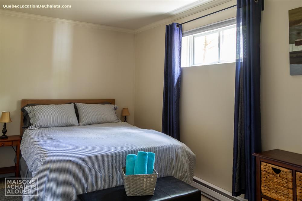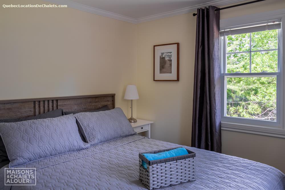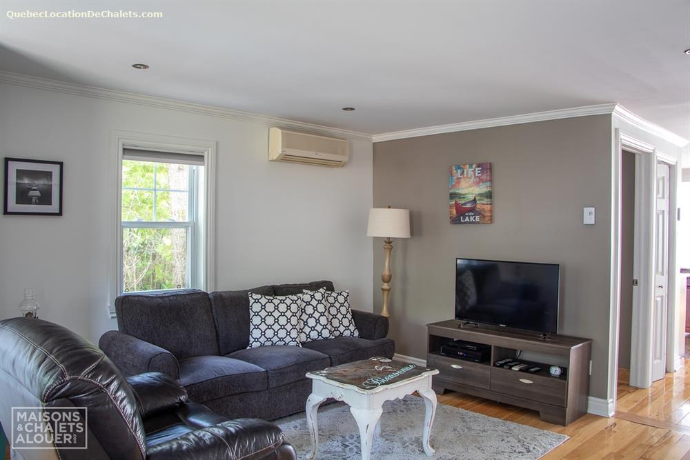 Situated directly on the shores of Lac Boissonneault in the Eastern Townships, this adorable cottage is ready to welcome you for a comfortable vacation any time of year. La Bellevue is named for the stunning view from a large deck overlooking the lake directly accessible from the dining room. At first glance, the sloping property gives the impression that the lake is right at your feet. Swimming is a popular summertime activity at Lac Boissonneault, whose pebbly bottom drops off gradually. Guests are also welcome to use one of the kayaks or try out the 4-person pedal boat. Out on the lake, try your hand at fishing for walleye, bass or perch. In winter, the region has a number of snowshoe and cross-country ski trails. If the ice is thick enough, you can skate on the lake or try ice-fishing. We’ll also be pleased to advise you as to the best hiking trails in the area. A private all-season covered spa is a great place to relax in privacy, whatever the weather. Large bay windows provide plenty of natural lighting and an uninterrupted view of the lake. The open-concept dining room and kitchen open directly onto the deck so you can head outdoors to enjoy meals carefully prepared in the fully equipped kitchen. Downstairs is also well lit and provides access to the veranda and back yard where the spa is located. This living room has 1 sofa bed, as well as a wood stove (wood provided).
