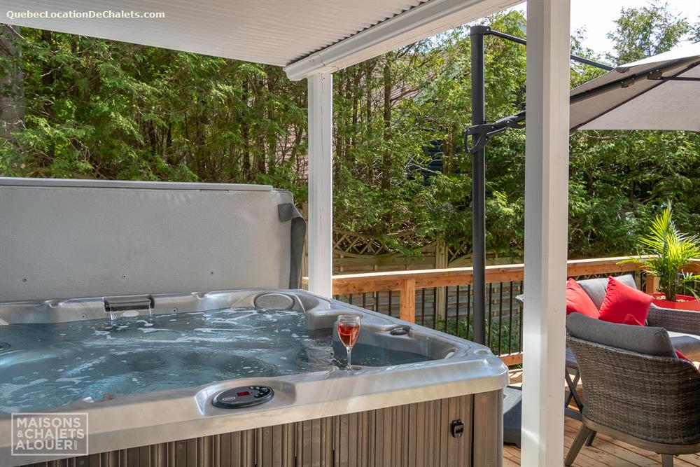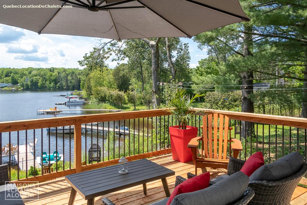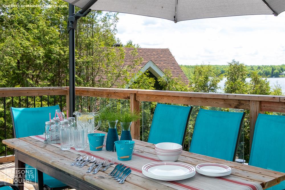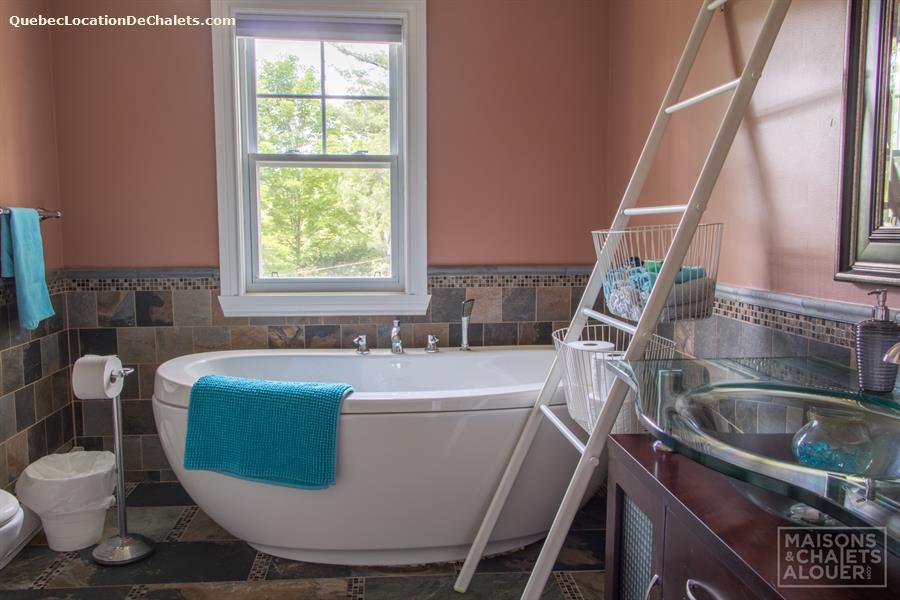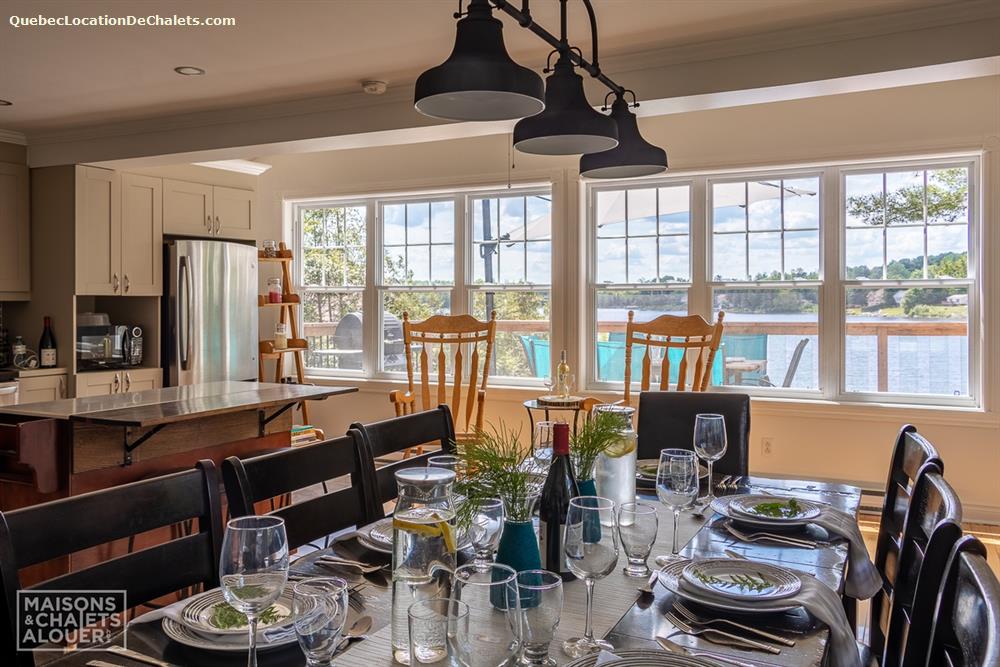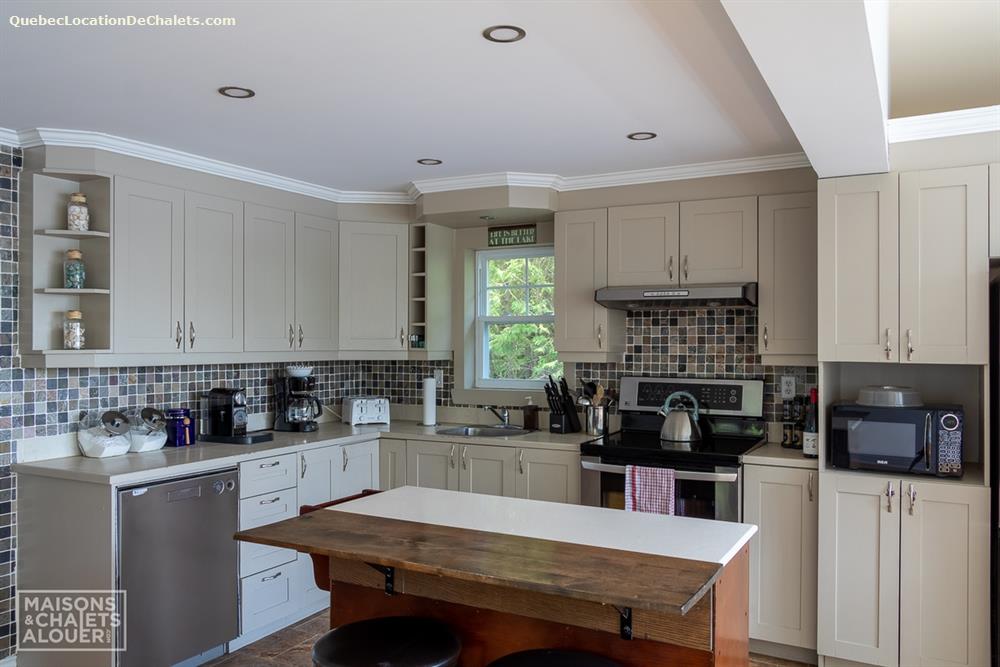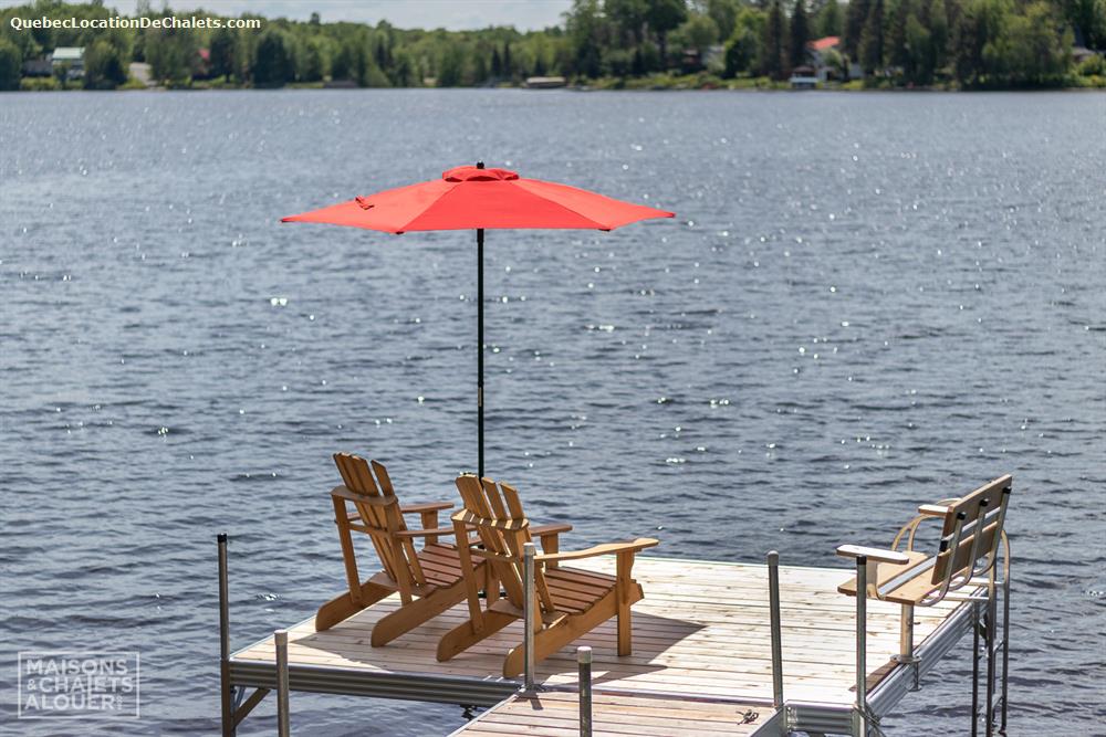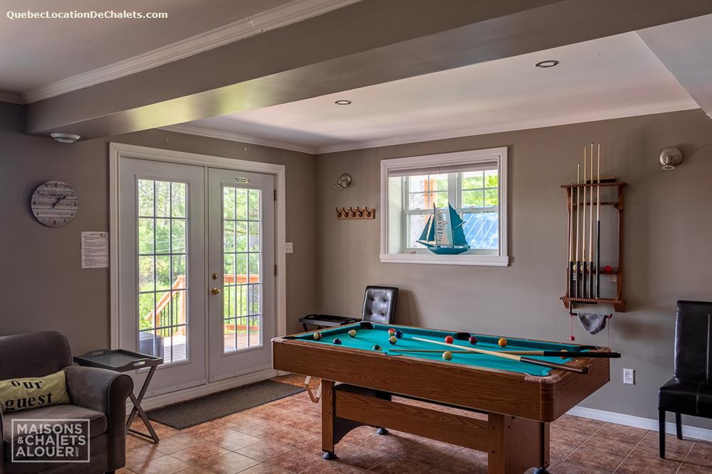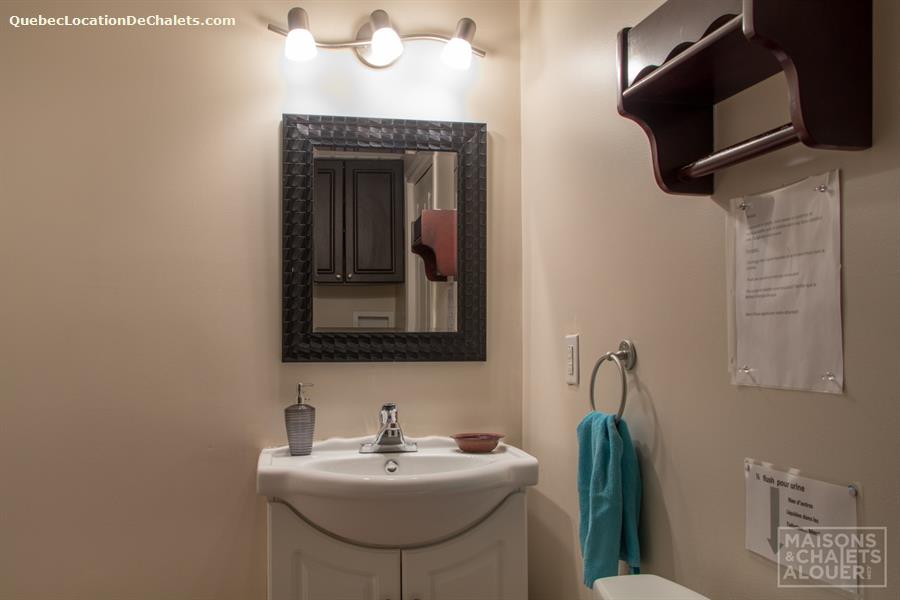 Situated directly on the shores of Lac Boissonneault in the Eastern Townships, this adorable cottage is ready to welcome you for a comfortable vacation any time of year. La Bellevue is named for the stunning view from a large deck overlooking the lake directly accessible from the dining room. At first glance, the sloping property gives the impression that the lake is right at your feet. Swimming is a popular summertime activity at Lac Boissonneault, whose pebbly bottom drops off gradually. Guests are also welcome to use one of the kayaks or try out the 4-person pedal boat. Out on the lake, try your hand at fishing for walleye, bass or perch. In winter, the region has a number of snowshoe and cross-country ski trails. If the ice is thick enough, you can skate on the lake or try ice-fishing. We’ll also be pleased to advise you as to the best hiking trails in the area. A private all-season covered spa is a great place to relax in privacy, whatever the weather. Large bay windows provide plenty of natural lighting and an uninterrupted view of the lake. The open-concept dining room and kitchen open directly onto the deck so you can head outdoors to enjoy meals carefully prepared in the fully equipped kitchen. Downstairs is also well lit and provides access to the veranda and back yard where the spa is located. This living room has 1 sofa bed, as well as a wood stove (wood provided).
