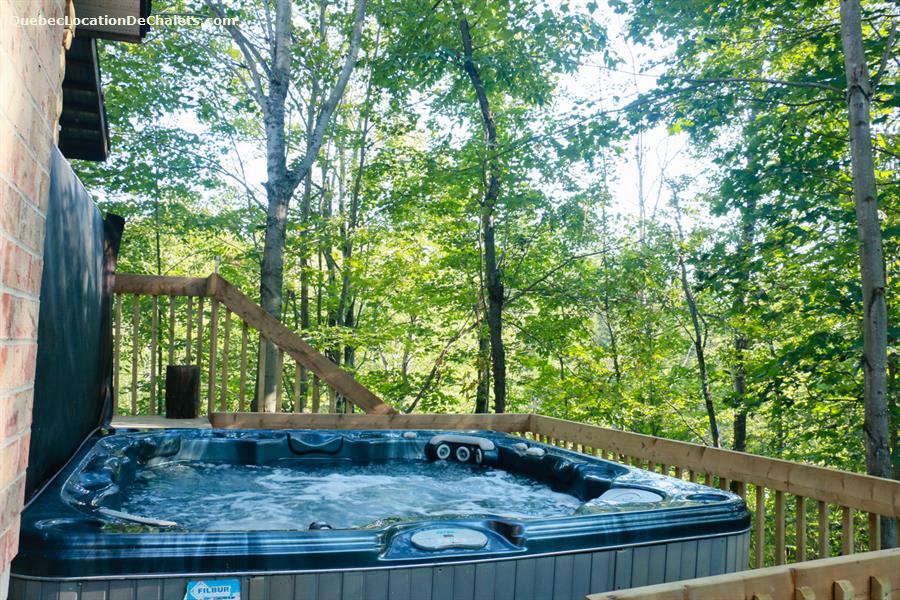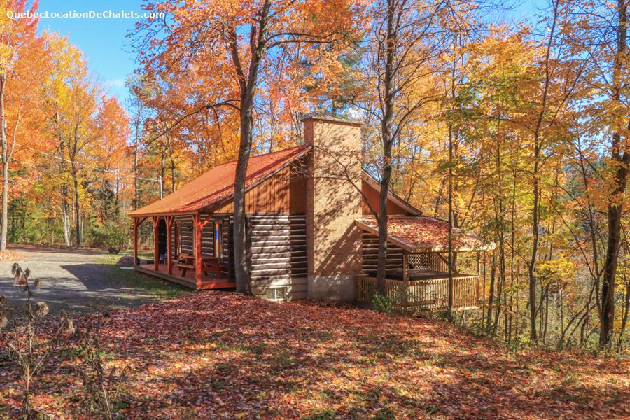 A traditional Canadian hunting camp in Cookshire-Eaton, this rustic log cottage far from civilization will charm you the moment you set eyes on it. Located in the heart of an Eastern Townships forest just 25 minutes from Sherbrooke, this is the perfect spot to experience a truly peaceful vacation with family or friends. Your stay won’t be complete without a dip in the all-season spa overlooking the forest. An outdoor fireplace and attractive dining area allow you to enjoy the beauties of nature all day long. The cottage has a covered veranda in the front and an even larger one in the back with a barbecue for serving up your favourite dishes. The area features many ponds, streams and wooded paths that are a delight to explore. You’re sure to come across birds, deer and perhaps even a moose or two. The property is magnificent in every season. As summer changes into fall, admire the spectacular colours on a hike or ATV outing-you can even try horseback riding! Winter is also a great time to visit and take advantage of snowmobile, cross-country ski and snowshoe trails. The region also boasts a strong cultural offering. This two-storey cottage has a maximum occupancy of 10. The ground floor features an open-concept dining room and modern, fully-equipped kitchen with stainless steel refrigerator and stove, wall wine rack, microwave and coffeemaker. Relax in front of the living room fireplace in a rocking chair or snuggled comfortably in an armchair. Central air conditioning ensures a comfortable stay. The modern bathroom has a shower bath. Ground floor: Open-concept kitchen, dining room and living room / 1 bedroom / 1 bathroom Downstairs: 2nd living room with wall bed and a sofa-bed / 2 closed bedrooms
