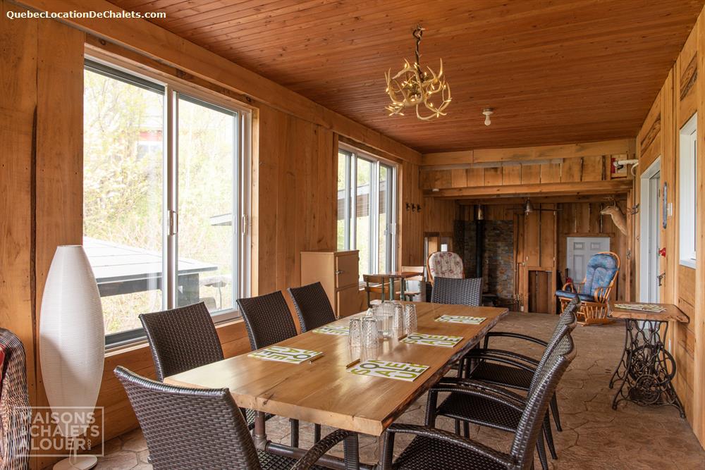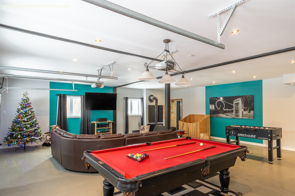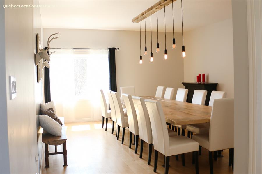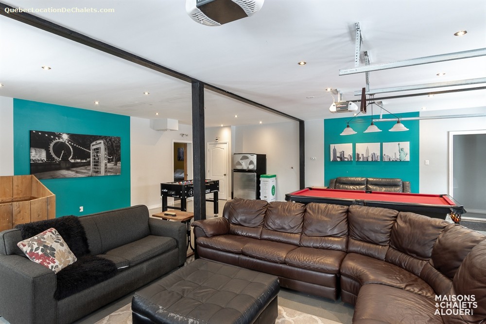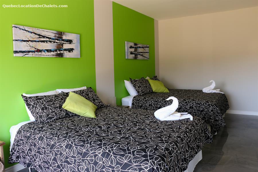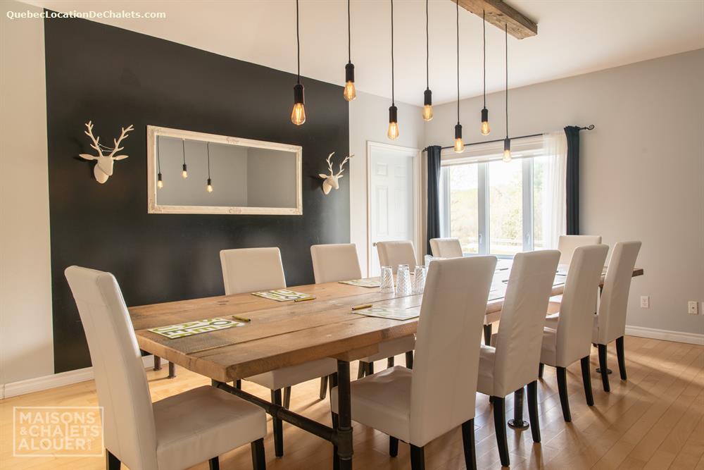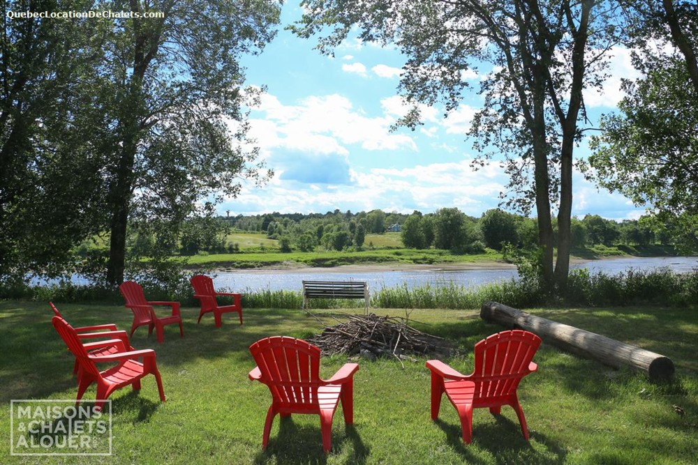 This magnificent property set on the banks of the Saint-François River is the perfect setting for a dream vacation. With room for 26, this attractive, modern property is ideal for large family gatherings and business events. With all the comforts of modern living combined with a touch of rustic charm, Aux Rives du Bonheur is sure to please any guest. Large veranda windows let in plenty of natural lighting and provide an excellent view of the four-acre property. Entertainment options abound in the spacious living room with pool and soccer tables, large flat-screen television and wood stove. The landscaped property has several areas to play or relax, including a patio with a six-person spa, fire pit, volleyball court, and boat ramp (kayak, canoe available onsite). Please note that the river is shallow in places and is appropriate only for kayaks, canoes. Currents may be strong when the river is high, so always wear a lifejacket. Business events: The dining room can also serve as an elegant and attractive conference room. It has an efficient lighting system with variable control and blackout curtains for projected presentations (projector not provided). The kitchen includes a professional coffeemaker for large groups. Aux Rives du Bonheur has everything for an enjoyable stay! Spread over 3 floors are 8 modern-style closed bedrooms with new queen-size beds, 2 complete bathrooms, a kitchen with the latest in appliances (stainless steel coffeemaker, toaster, stove, refrigerator and dishwasher), and a trendy dining room that can seat 14 comfortably.